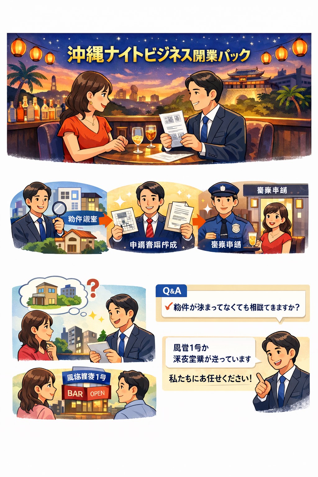 沖縄ナイトビジネス開業パック 公開日:2025年12月20日 深夜酒類提供飲食店営業開始届出特定遊興飲食店営業風俗営業許可飲食店営業許可 「沖縄ナイトビジネス開業パック」はじめました! 業務範囲一覧(サービス内容) 【本パックに含まれるサービス内容】 区分 内容 事前確認 物件用途・用途地域・営業可否の確認 許可判断 風俗営業1号/深夜酒類提供飲食店の要否 […] 続きを読む